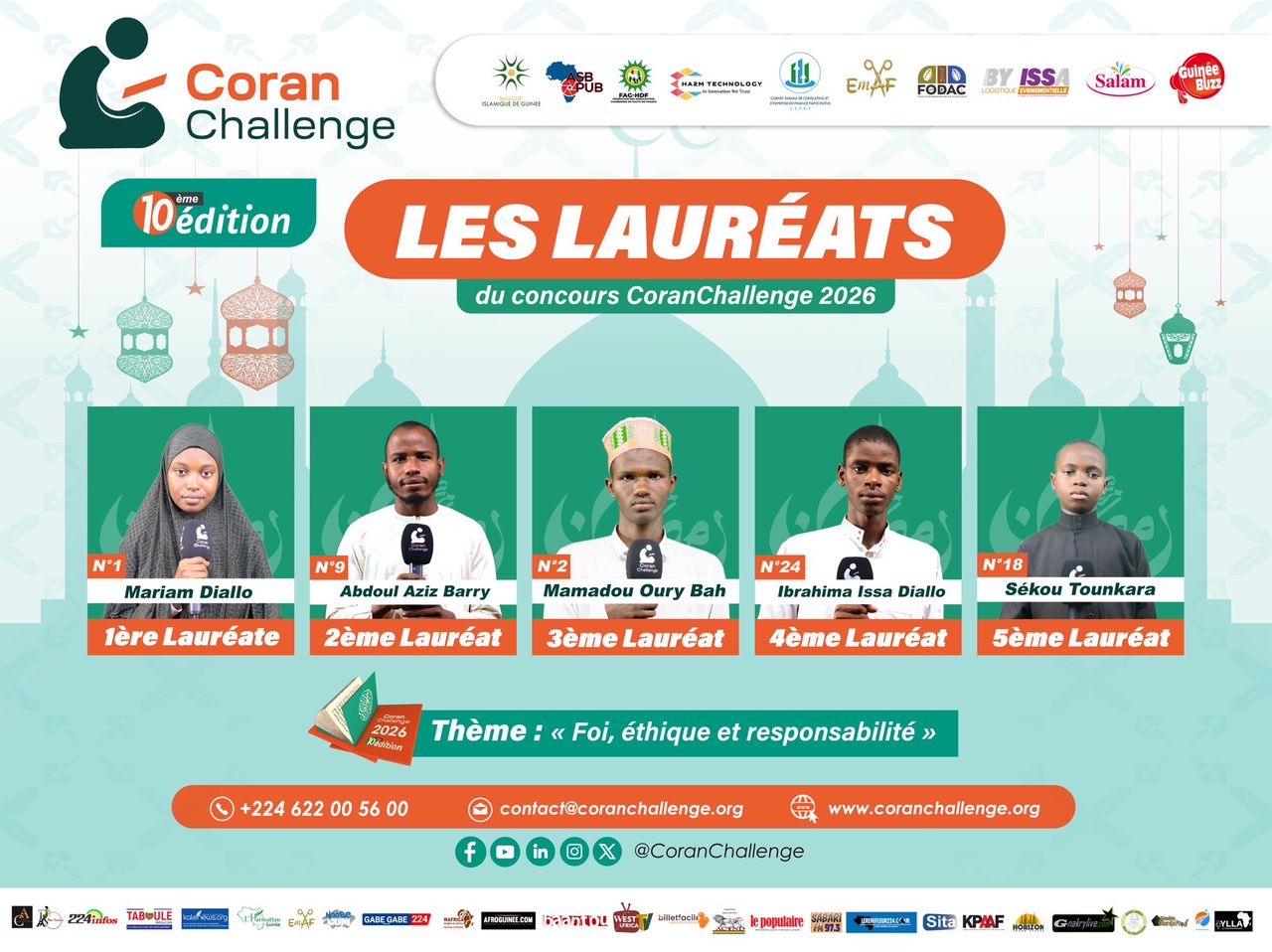 Au terme d’une compétition de haut vol, cinq lauréats se sont illustrés parmi les 27 candidats en lice, prouvant qu’en une décennie, le Coran Challenge a su se muer en une institution incontournable pour la jeunesse guinéenne éprise de culture islamique.