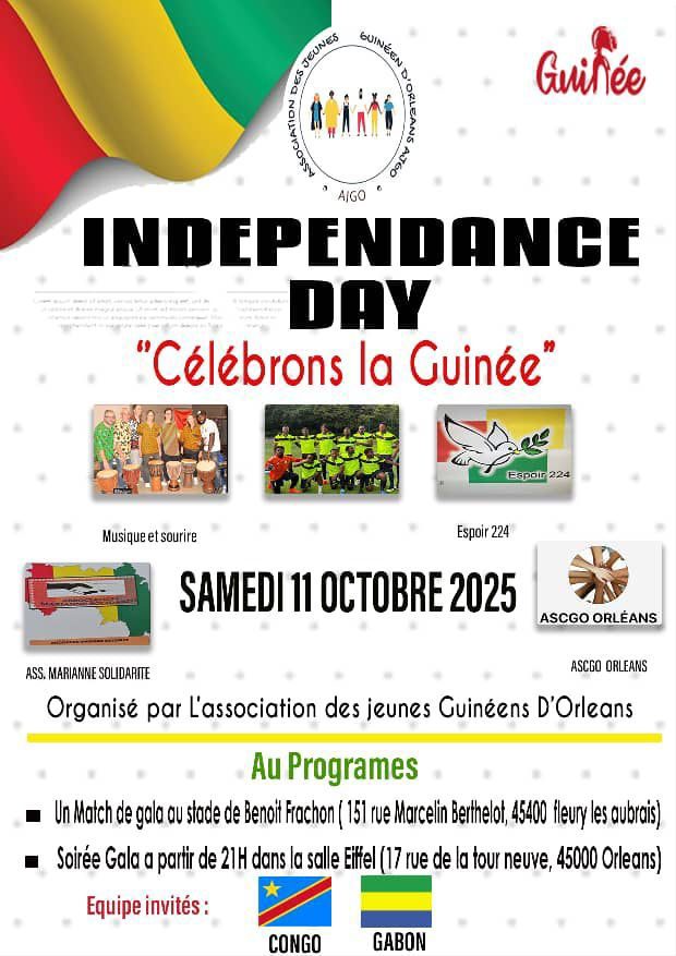 À l’instar d’autres structures associatives, l’Association des Jeunes Guinéens d’Orléans (AJGO) se prépare à célébrer, sous le slogan « Indépendance Day, célébrons la Guinée », la 67ème fête nationale guinéenne du 2 octobre 1958, en organisant un événement festif le samedi 11 octobre prochain.