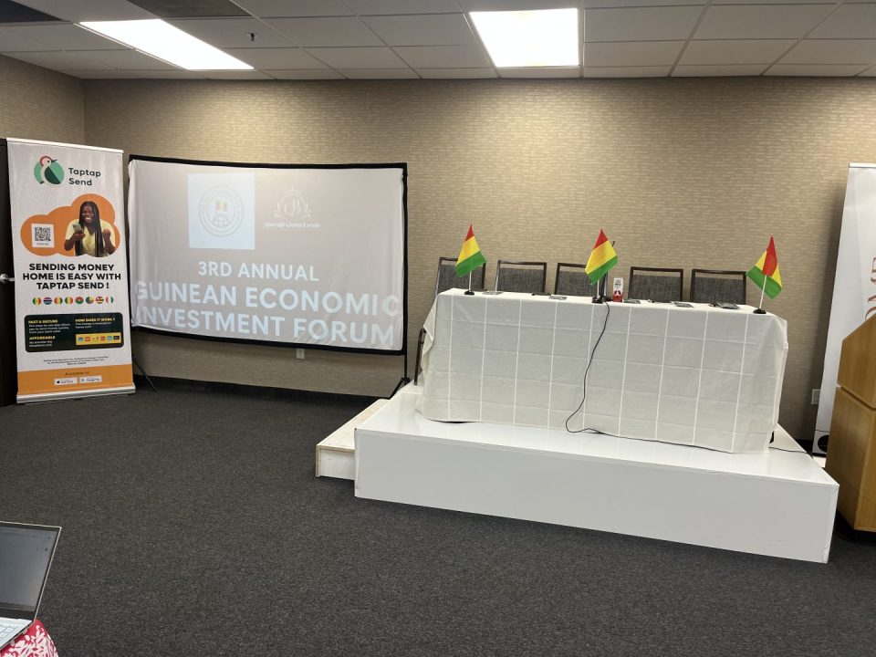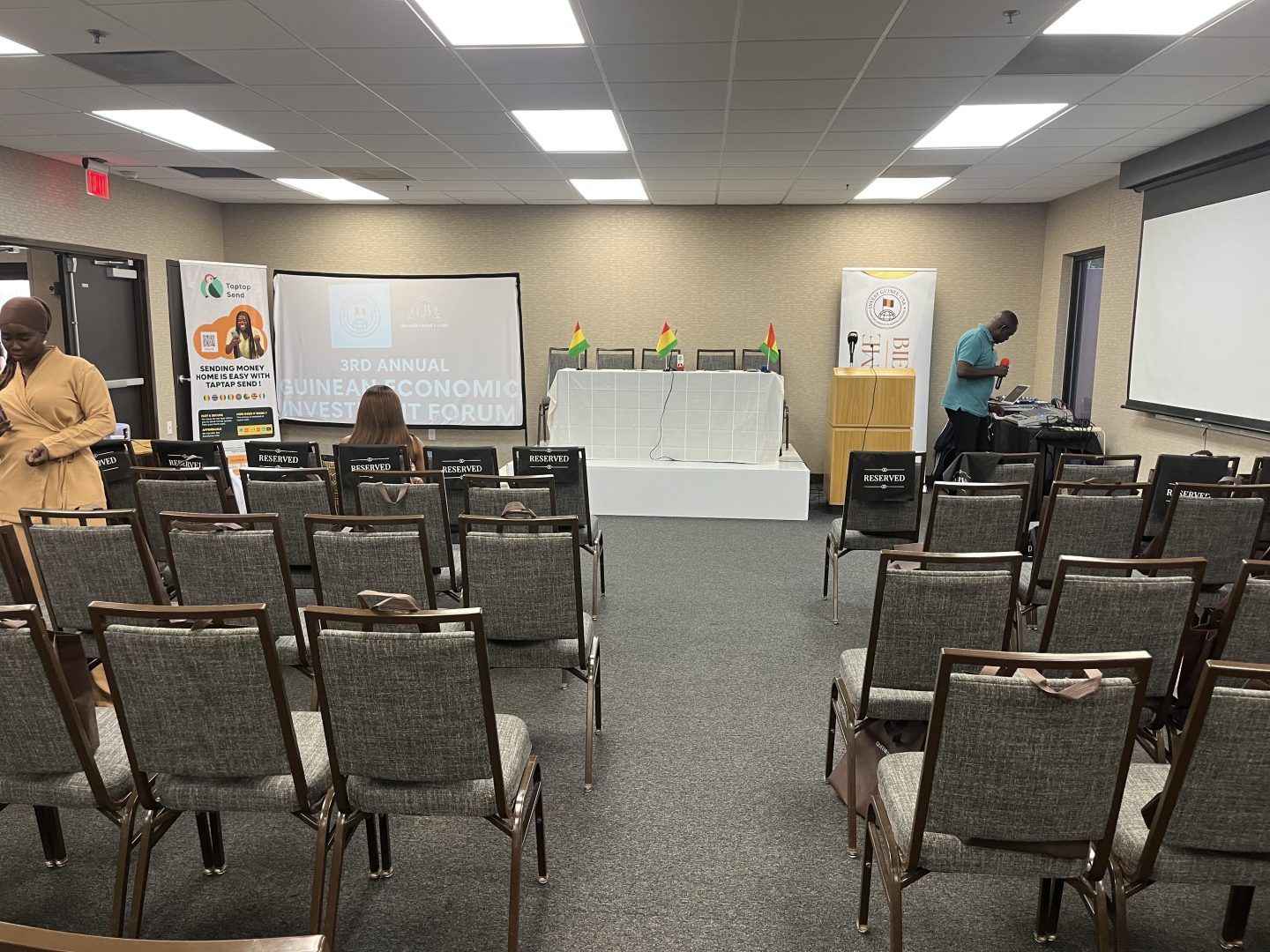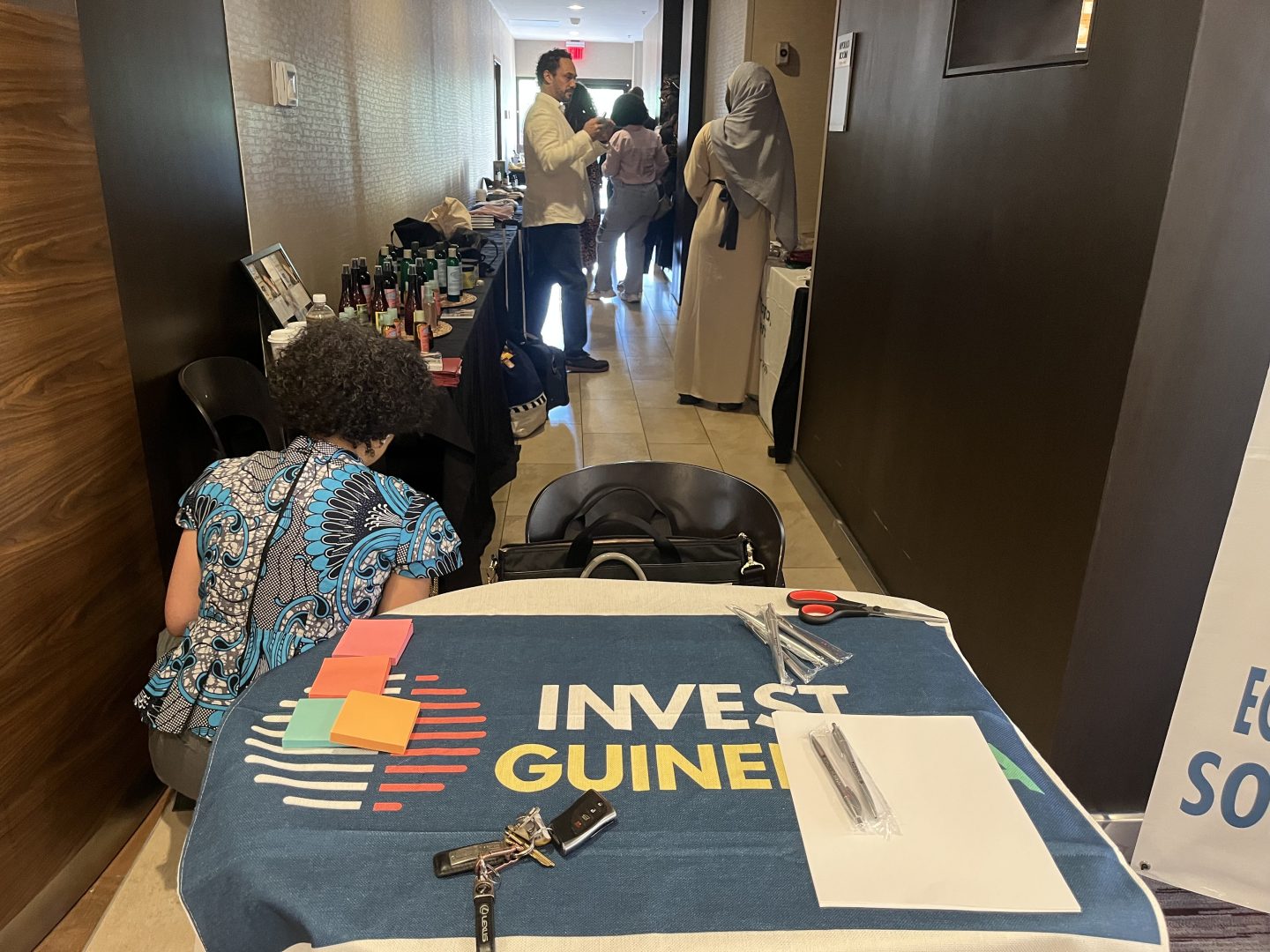 Invités, panélistes, sponsors, mécènes et partenaires du Guinea Invest Forum se présentent à l’entrée principale de la salle de conférence, décorée par les membres du comité d’organisation sous la direction de Mme Hawa Barry Diallo.
