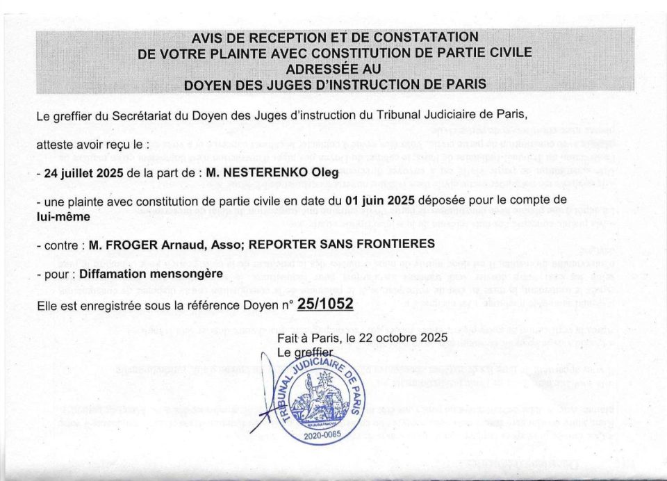 Fort de preuves matérielles et vérifiables, réfutant point par point les allégations fallacieuses proférées par Reporters Sans Frontières, une plainte assortie d’une constitution de partie civile a été déposée auprès du juge d’instruction du Tribunal Judiciaire de Paris.